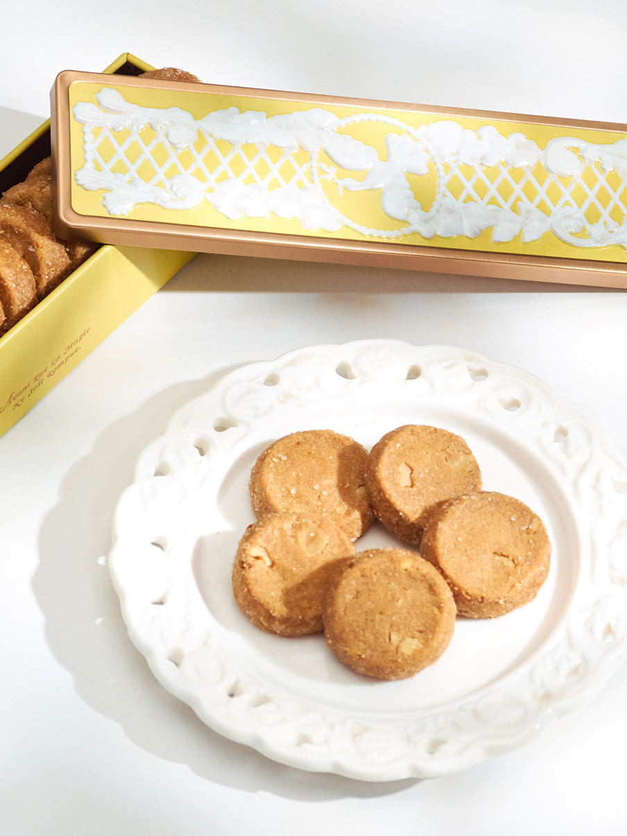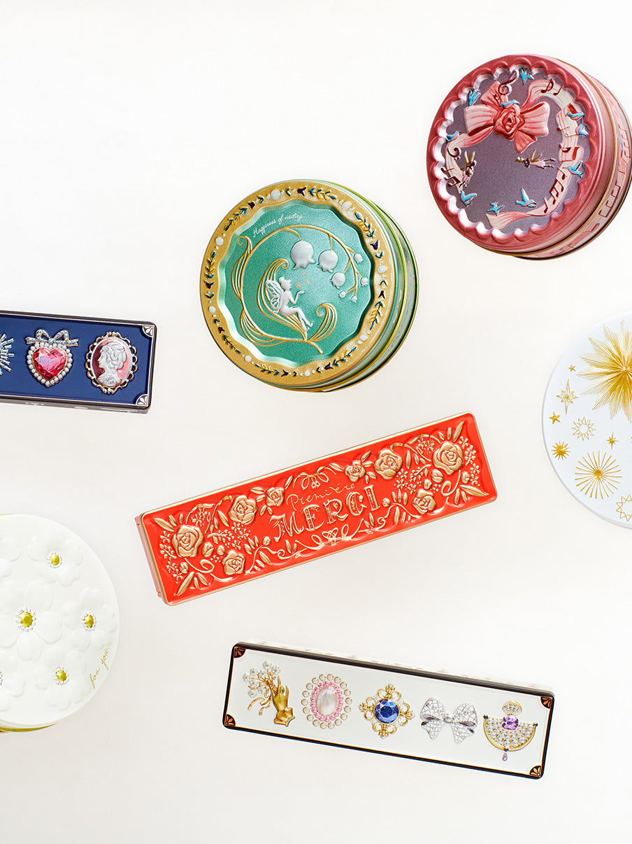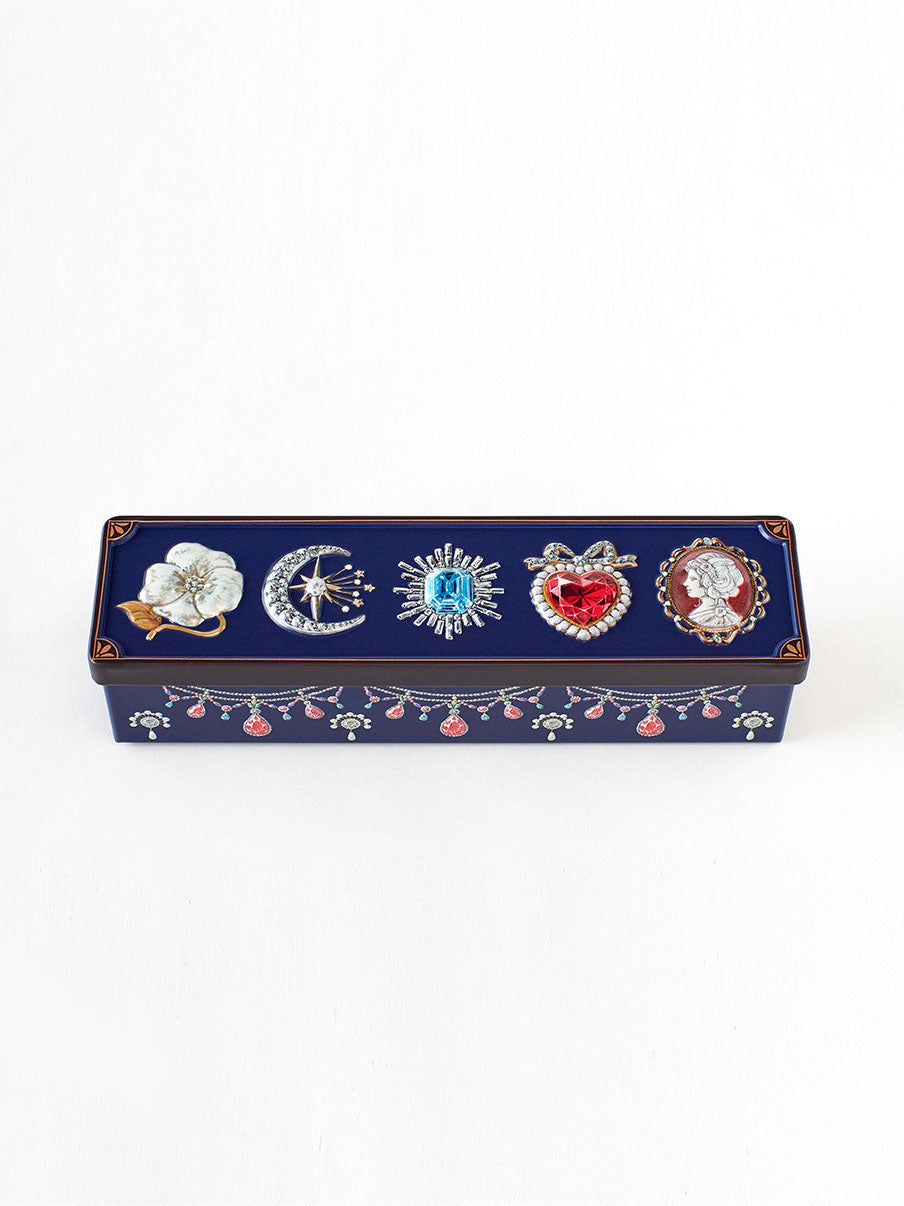 フランス語で宝石を表す「ビジュー」。深い青の缶にはキラキラと光る装飾品が散りばめられています。食べ終わった後には、小物入れとしてお使いいただけます。