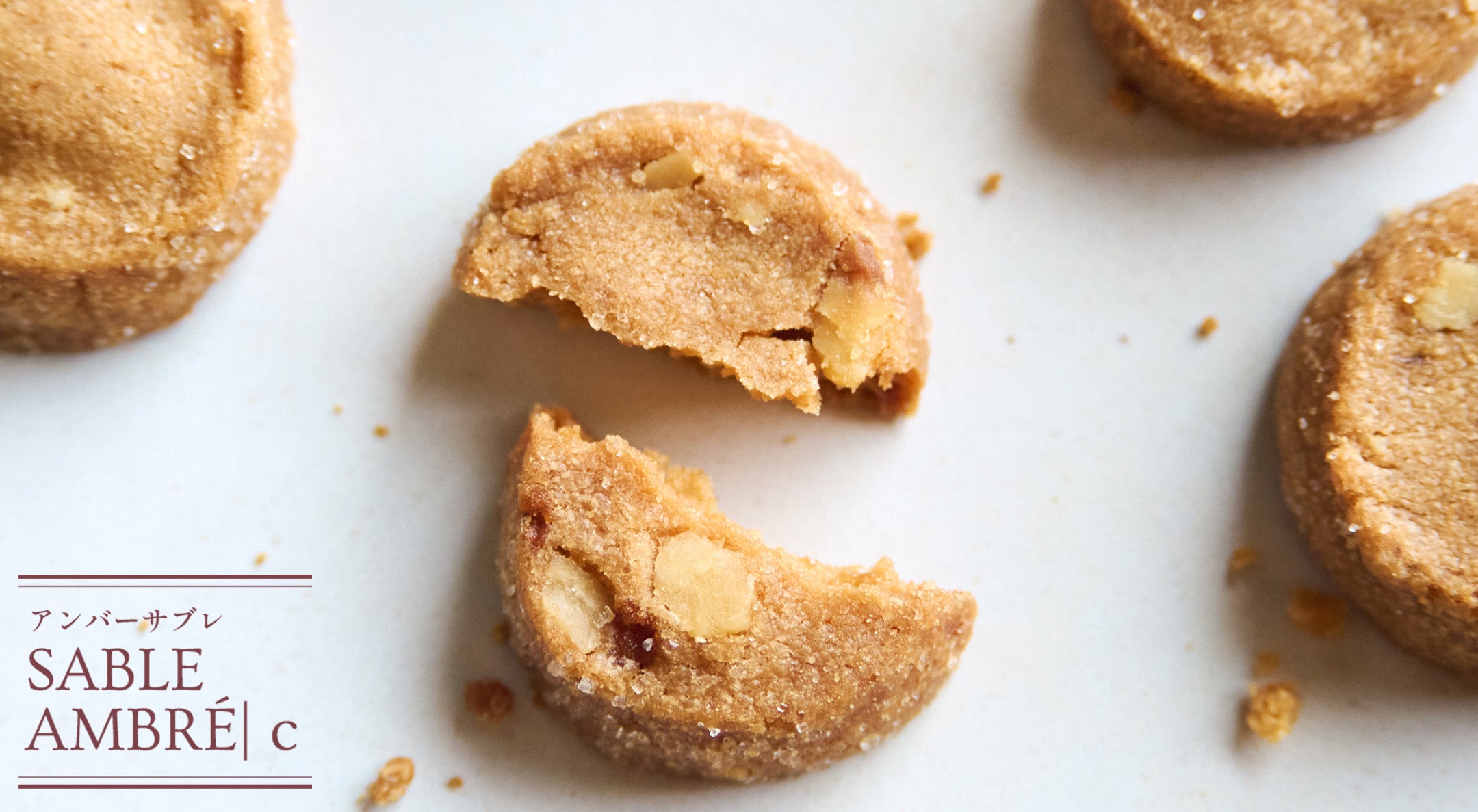 アンバーサブレ:小麦粉(国内製造)、食塩不使用バター、黒糖、くるみ、海塩/カラメル色素、香料、(一部に小麦、乳成分、くるみを含む)
