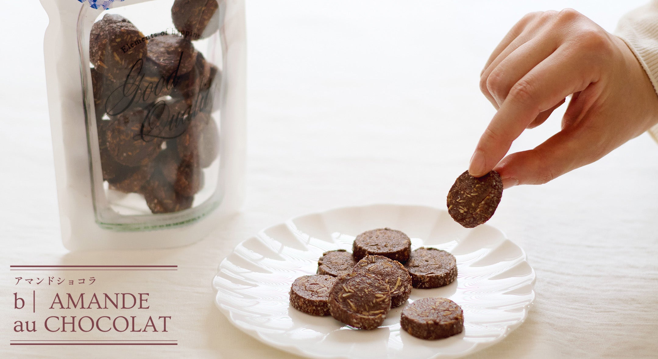 アマンドショコラ:小麦粉(国内製造)、食塩不使用バター、アーモンドスライス、グラニュー糖、全卵、ココアパウダー、海塩、シナモンパウダー/膨張剤、(一部に小麦、卵、乳成分を含む)