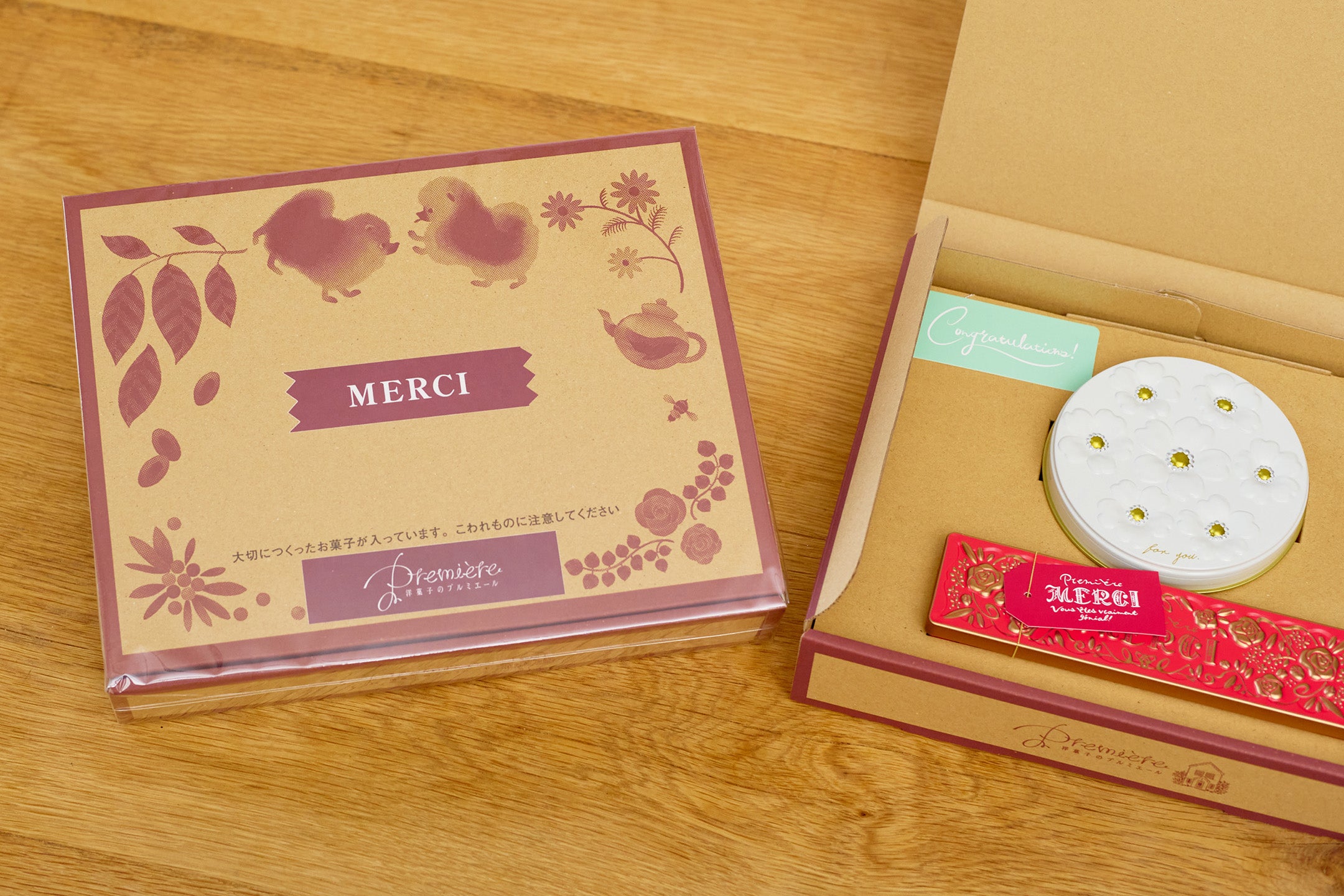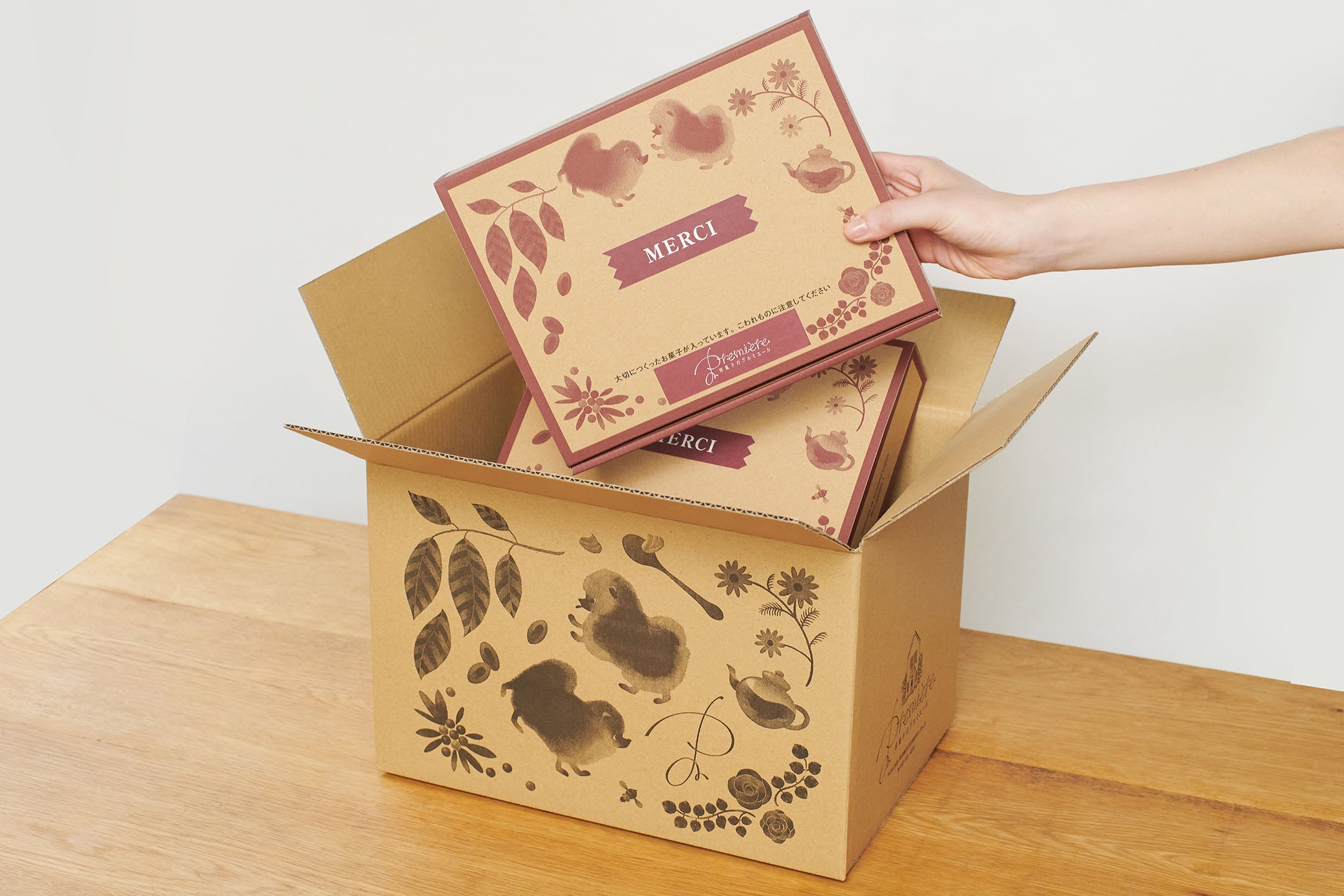 プルミエールの看板犬があしらわれたクラフトボックスに入れてお届けします。紙袋も同梱してありますので、お渡しの際は箱ごとお持ちいただけます。