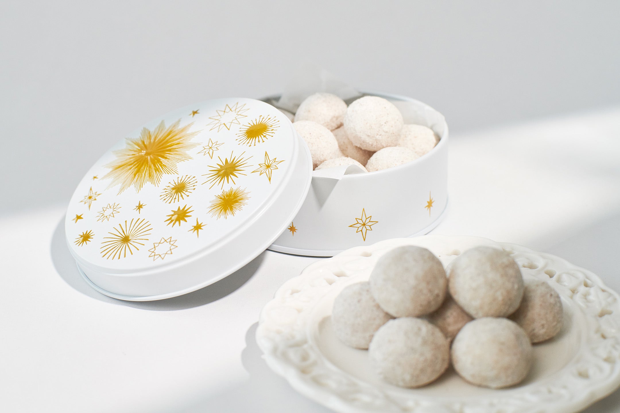 オーロラの煌めきを思わせる白い缶に、アールグレイの香りとふんわりとした食感が魅力のスノーボールクッキーを詰めました。