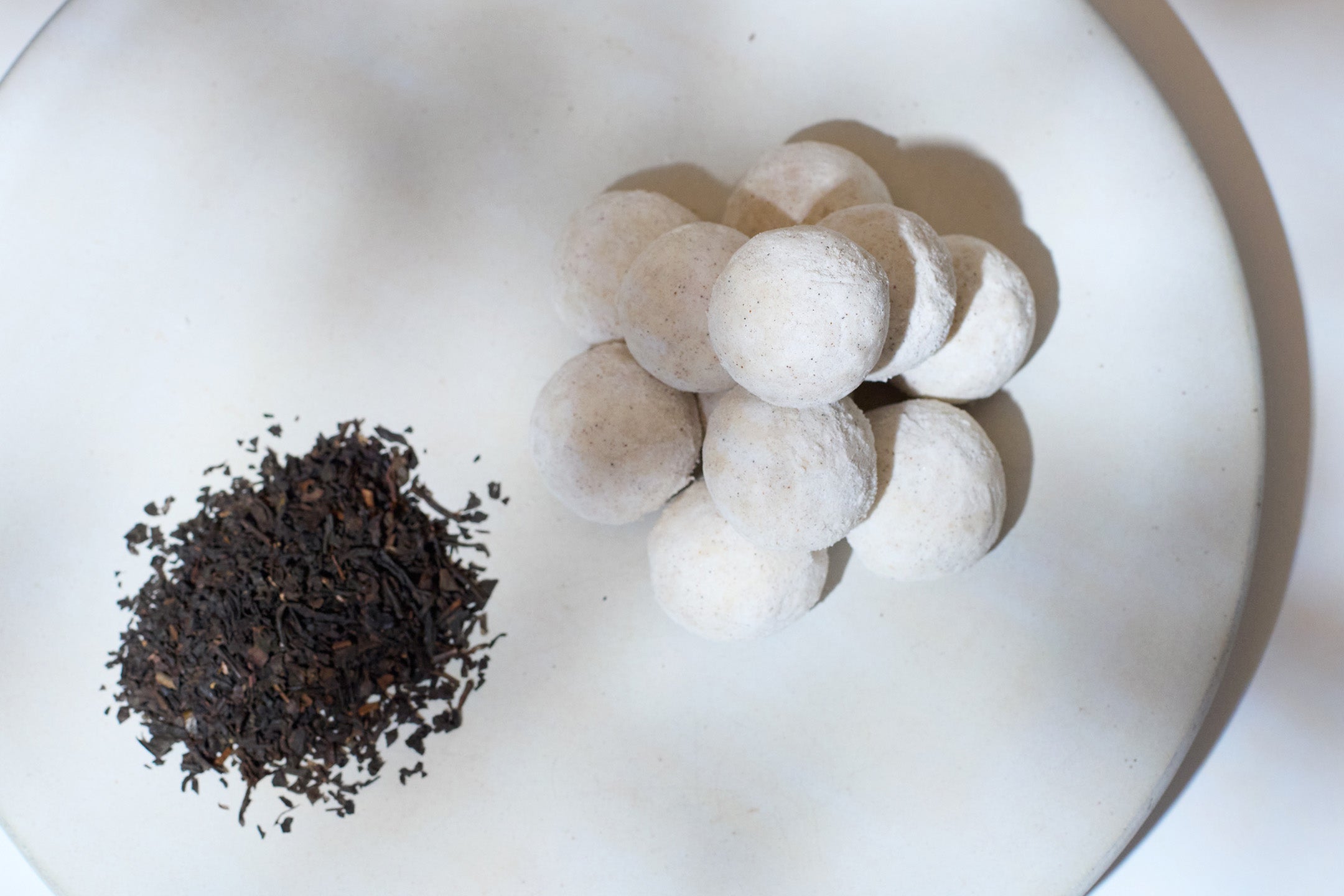スノーボールクッキーに最適な紅茶として、厳選したアールグレイの茶葉をたっぷり使用しました。さらに、発酵バターを加え、香り豊かな口あたりを実現。卵は使用していません。