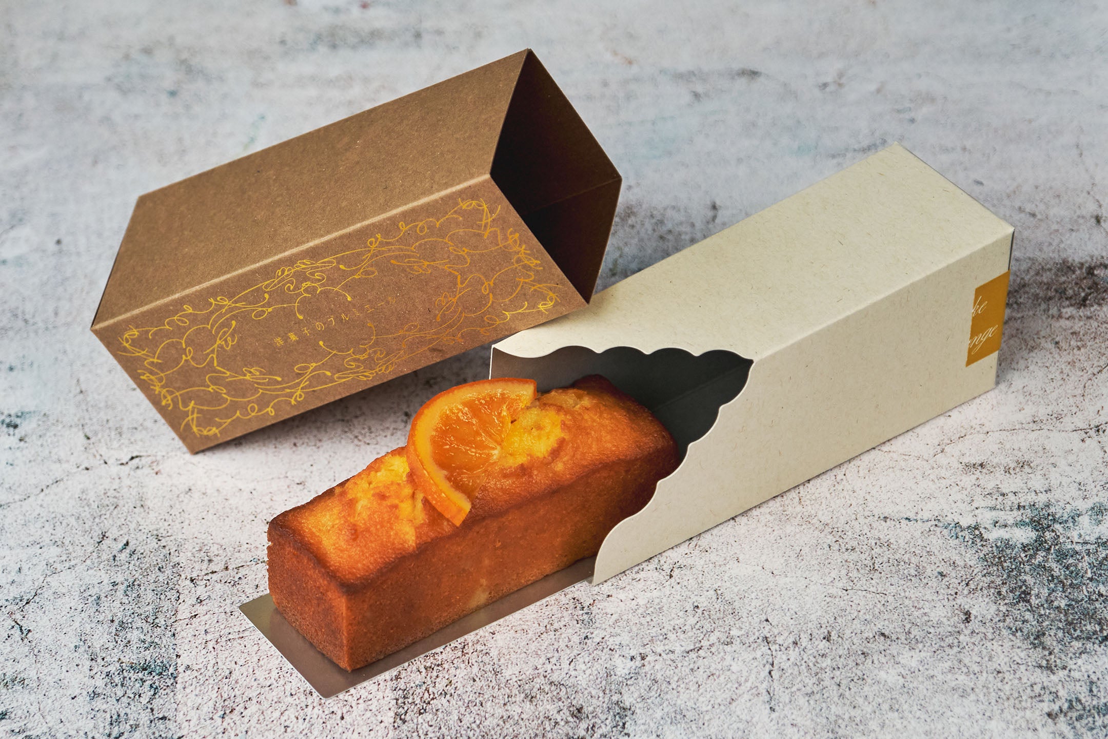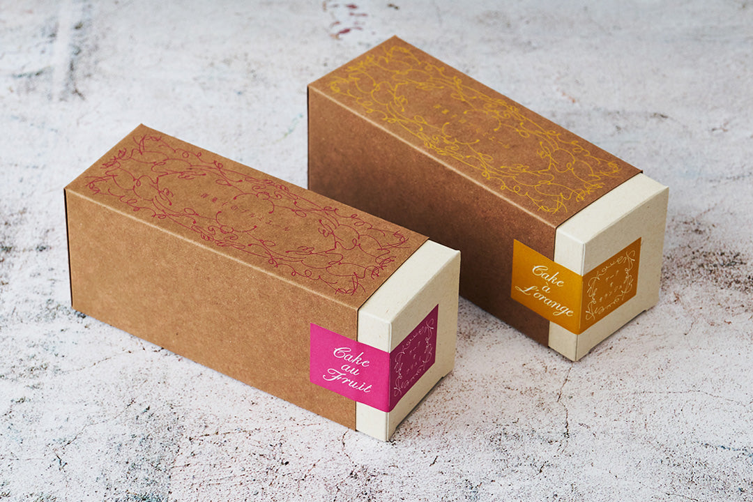 温かい印象のボックスにあしらわれたオレンジ箔の植物模様は、プルミエールで育てられた植物がモチーフ。箱をスライドすると現れる切り込みはお店の屋根の形。中から出てくるケーキを引き立てる一箱です。