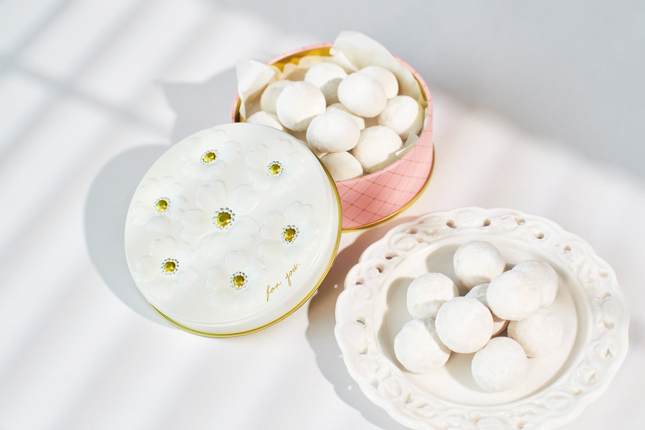 真っ白な花があしらわれた缶には、さくっと軽やかに崩れ、口の中でほろりと溶ける、スノーボール プレーンが詰まっています。大切な方へのプレゼントにも、自分へのささやかなご褒美にもぴったりです。