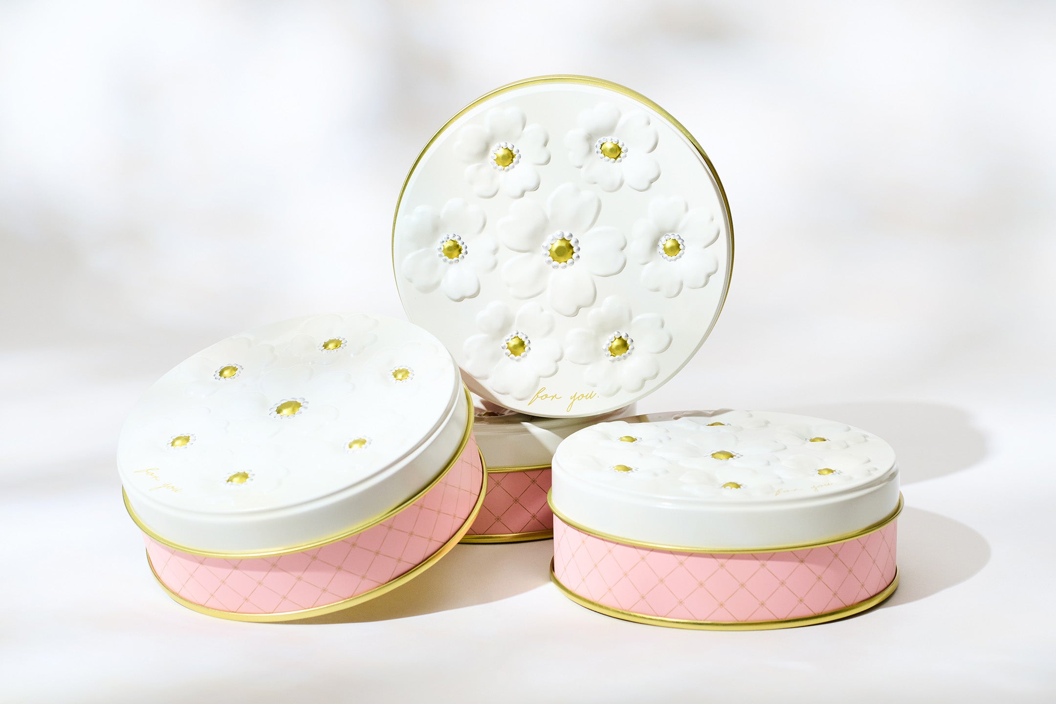 花束を贈るようにお菓子を贈る。缶には真っ白な花があしらわれており、開ける瞬間の驚きと喜びを演出します。食べ終わった後には、小物入れとしてお使いいただけます。
