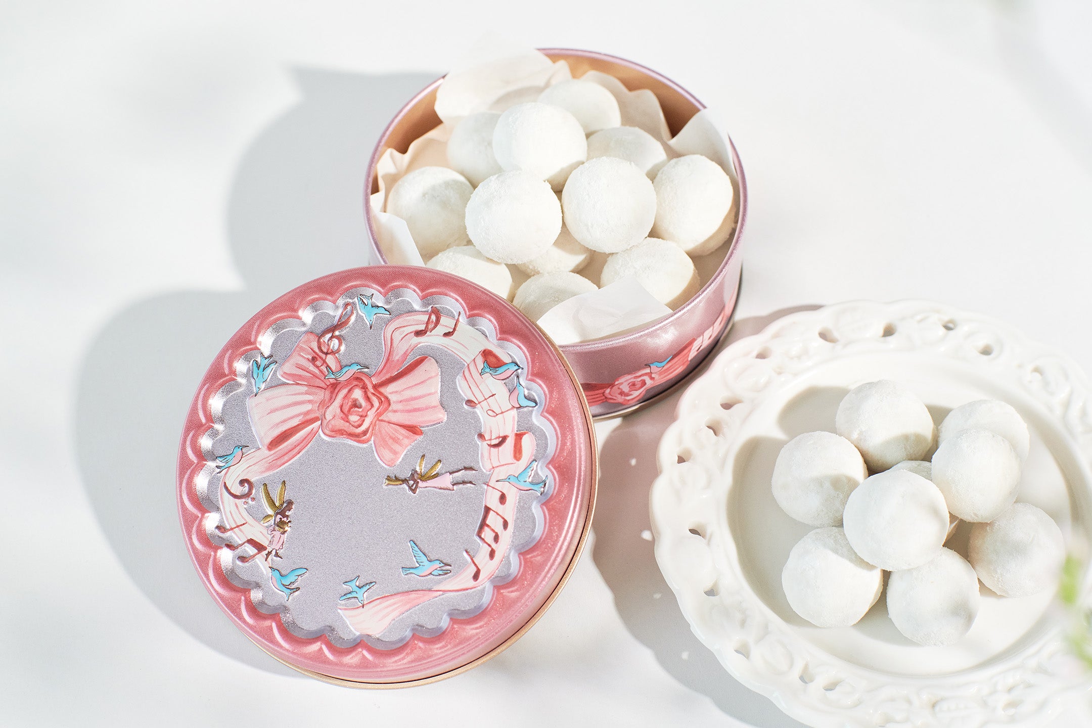 音符とリボンが描かれたロマンティックな缶に、ふんわりと口溶けするメープルシュガー入りのスノーボールが詰まっています。