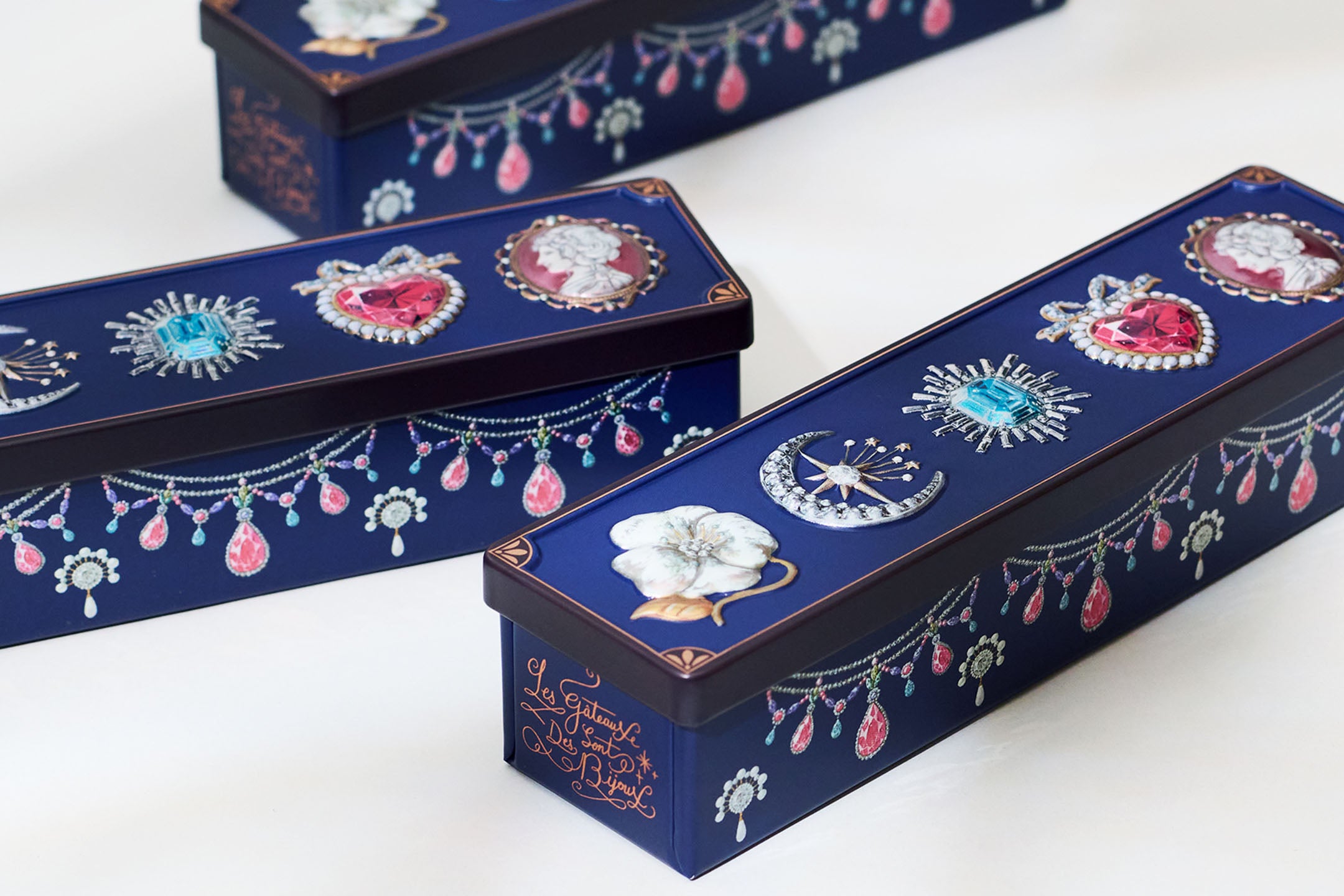 フランス語で宝石を表す「ビジュー」。深い青の缶にはキラキラと光る装飾品が散りばめられています。食べ終わった後には、小物入れとしてお使いいただけます。